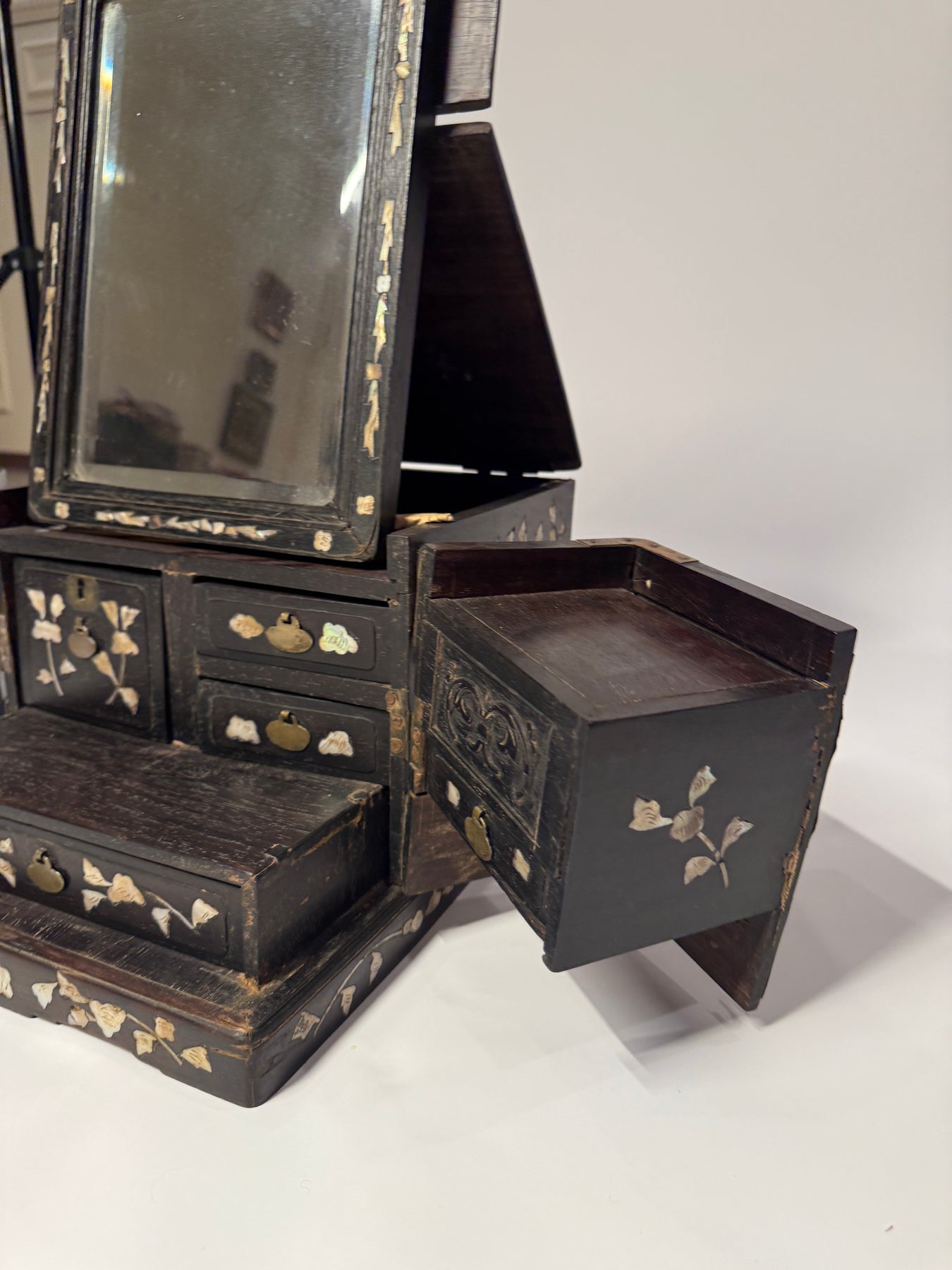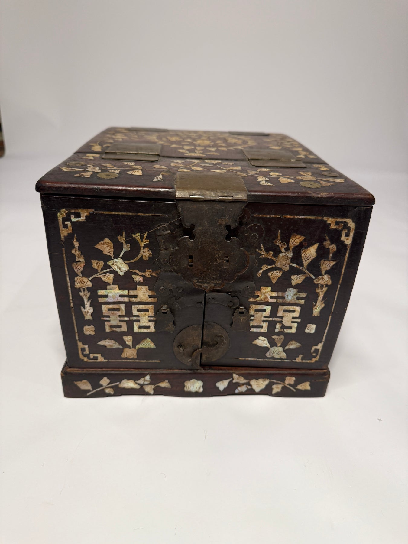 Authentic wood lacquer mother of pearl box, likely from Japan, certainly from Asia.