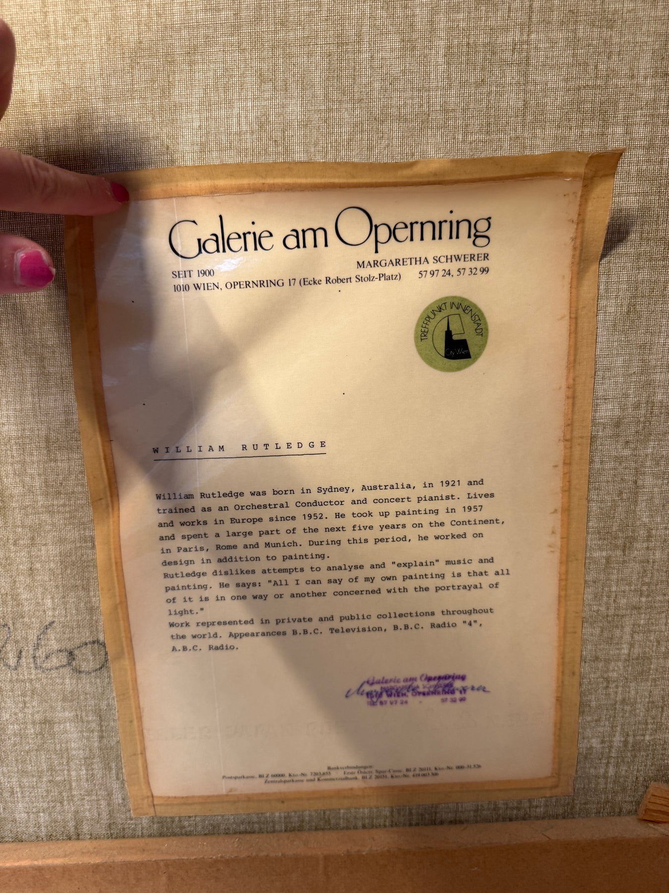 In perfect condition. Original oil painting by William Rutledge of Australia (see letter on pack of painting).