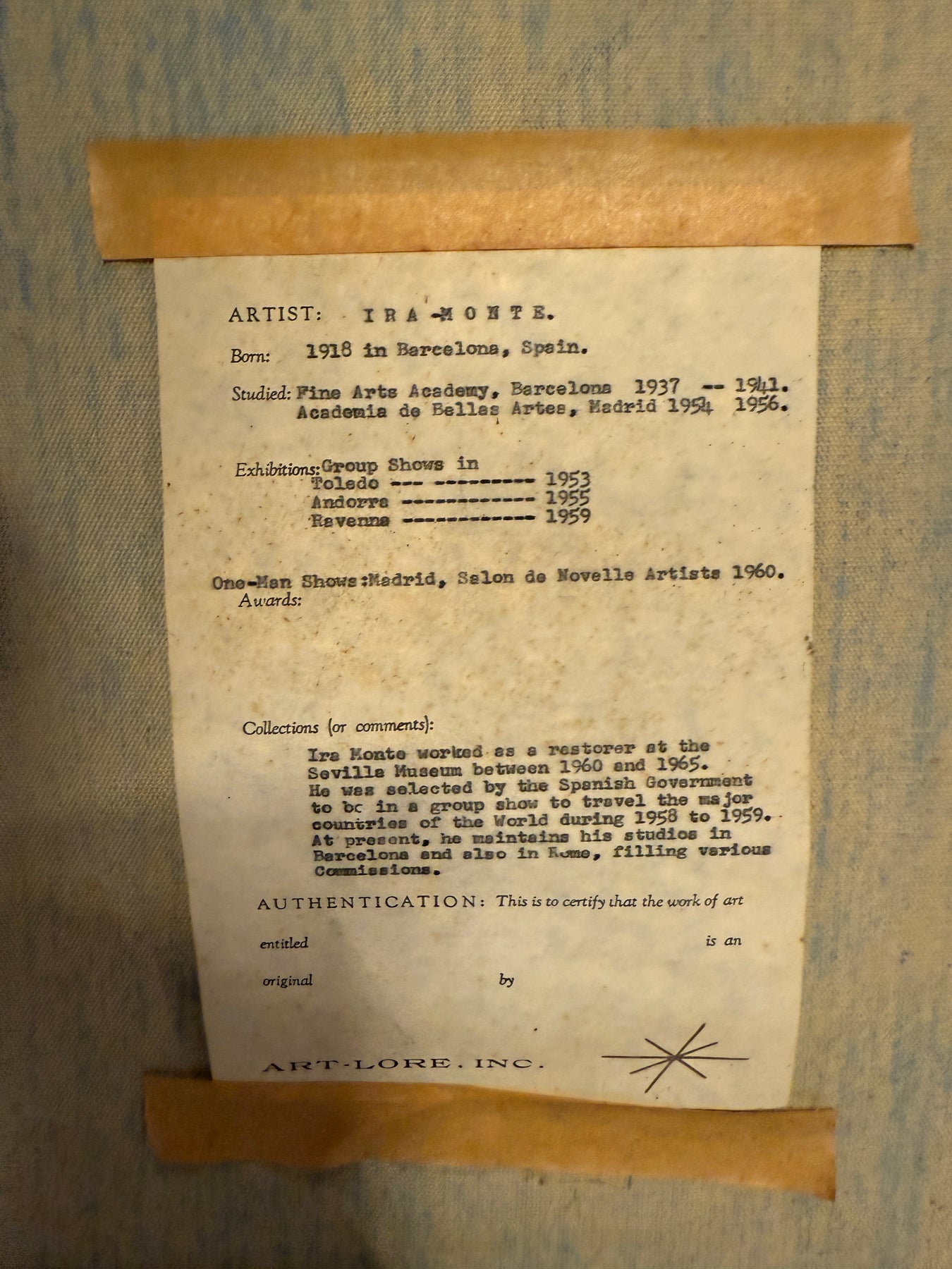 Ira Monte studied at the Fine Arts Academy in Barcelona (1937-1941) and the Academia de Bellas Artes in Madrid (1954). From 1960 until 1965 he worked as a conservator at the Sevilla Museum. He exhibited often during his lifetime and maintained studios in Barcelona and Rome.