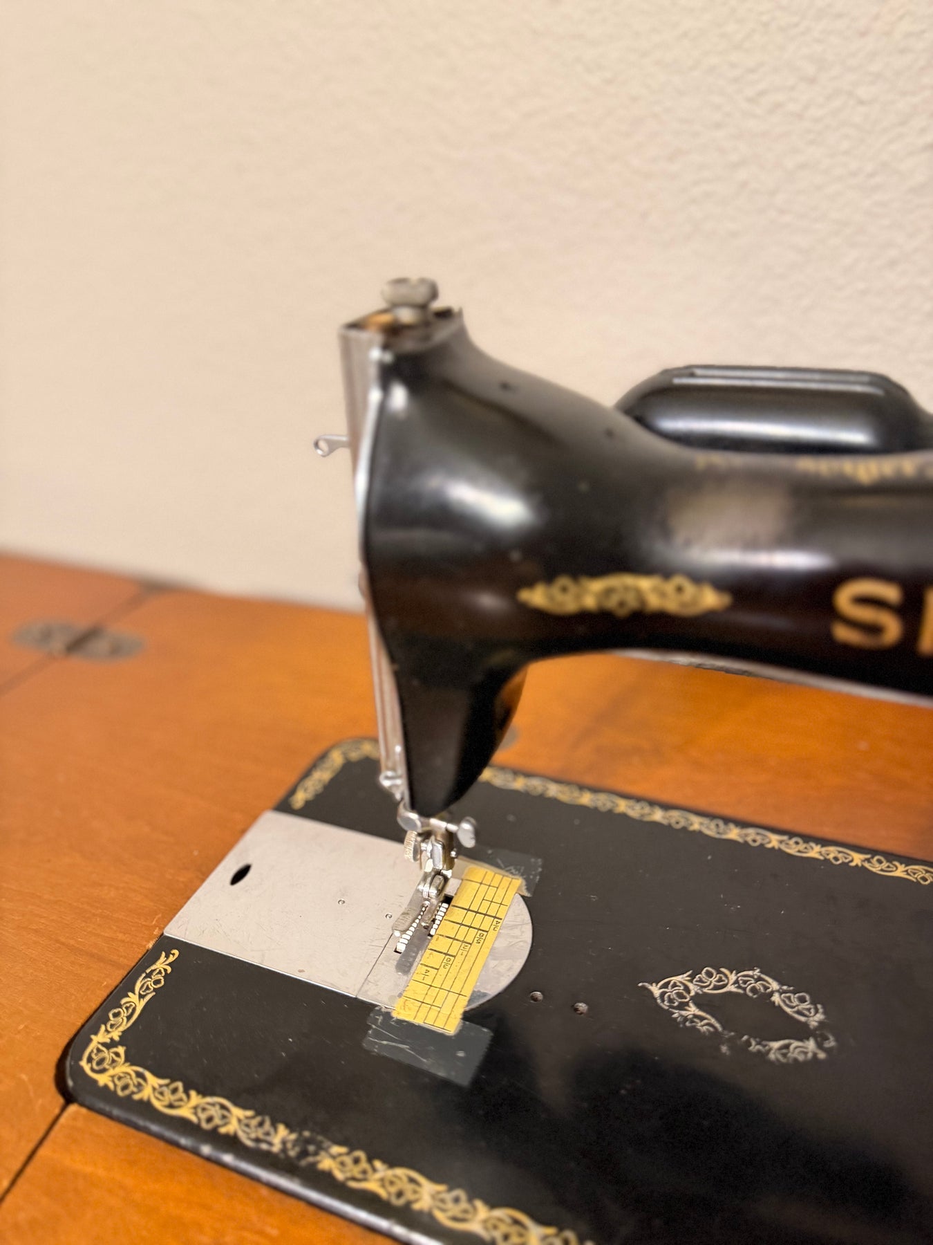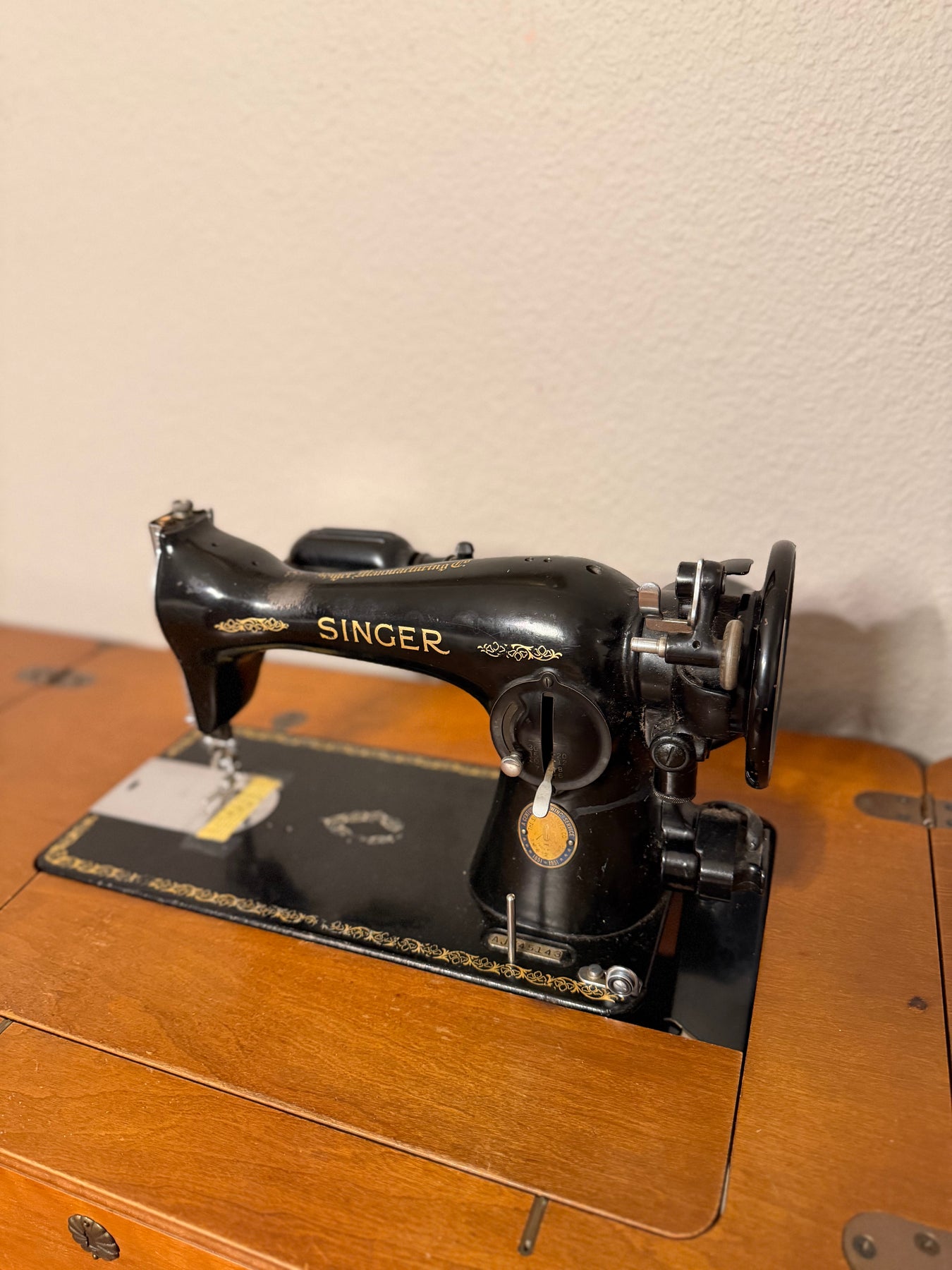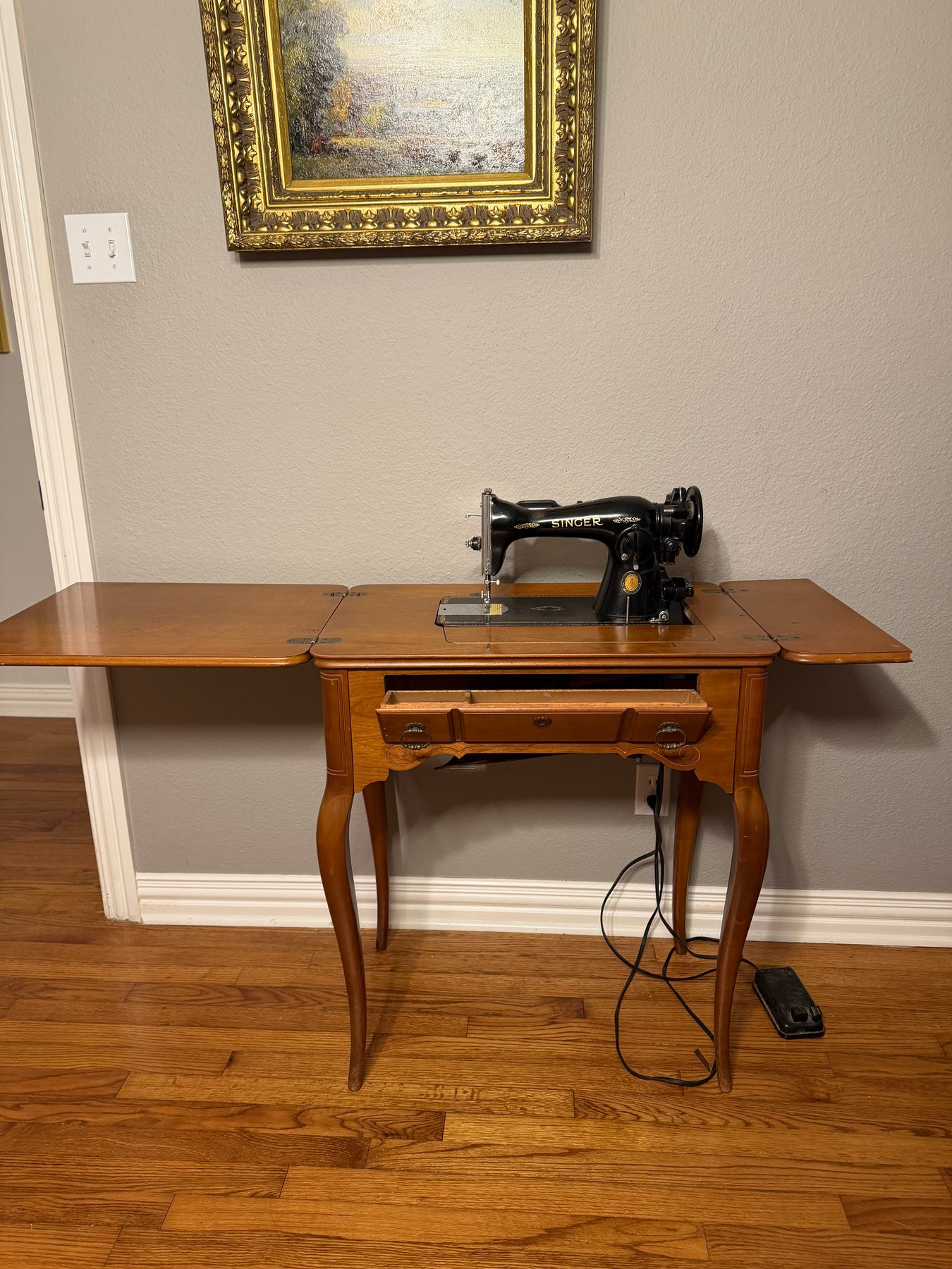 Antique, Functional Electric Sewing Machine Model 15-91 Wooden Desk with Needlepoint Bench