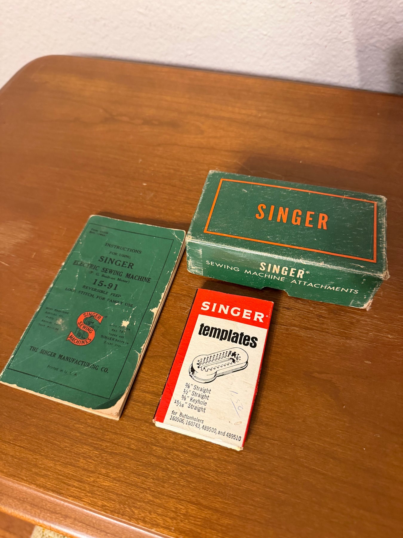 Fully functional. Comes with instruction manual; Singer templates; and Singer attachments. Needlepoint bench opens for more storage.